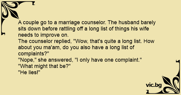 The counselor replied, "Wow, that's quite a long list. How about you ma'am, do you also have a long list of complaints?"