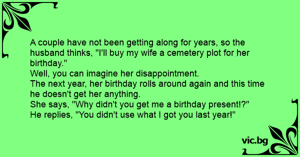 A couple have not been getting along for years, so the husband thinks, "I'll buy my wife a cemetery plot for her birthday."