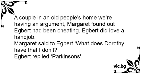 A couple in an old people’s home we’re having an argument, Margaret found out Egbert had been cheating. Egbert did love a hаndjов.