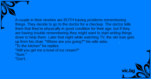 A couple in their nineties are BOTH having problems remembering things. They decide to go to the doctor for a checkup. The doctor tells them that they're physically in good condition for their age, but if they are having trouble remembering they might want to start writing things down to help them. Later that night while watching TV, the old man gets up from his chair. "Where are you going?" his wife asks.