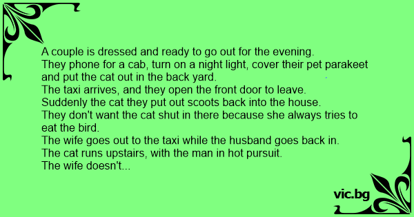 They phone for a cab, turn on a night light, cover their pet parakeet and put the cat out in the back yard.