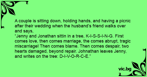 “Jenny and Jonathan sittin in a tree, K-I-S-S-I-N-G. First comes love, then comes marriage, the comes abrupt, tragic miscarriage! Then comes blame. Then comes despair, two hearts damaged, beyond repair. Johnathan leaves Jenny, and writes on the tree: D-I-V-O-R-C-E.”