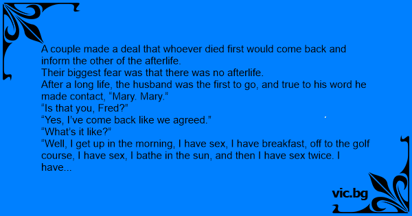 A couple made a deal that whoever died first would come back and inform the other of the afterlife.