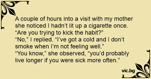 A couple of hours into a visit with my mother she noticed I hadn’t lit up a cigarette once. “Are you trying to kick the habit?”