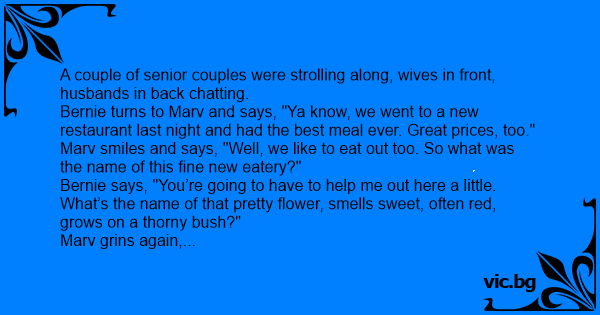 Bernie turns to Marv and says, "Ya know, we went to a new restaurant last night and had the best meal ever. Great prices, too."