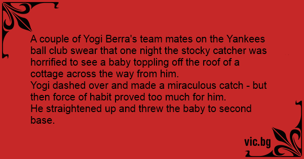 A couple of Yogi Berra's team mates on the Yankees ball club swear that one night the stocky catcher was horrified to see a baby toppling off the roof of a cottage across the way from him. Yogi dashed over and made a miraculous catch - but then force of habit proved too much for him. He straightened up and threw the baby to second base.