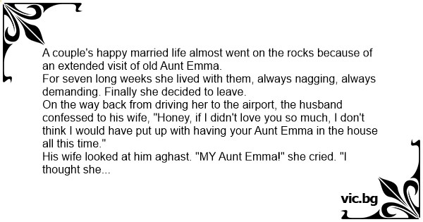 His wife looked at him aghast. "MY Aunt Emma!" she cried. "I thought she was YOUR Aunt Emma!"