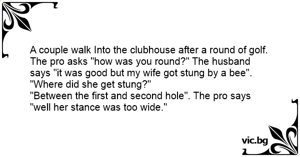The pro asks "how was you round?" The husband says "it was good but my wife got stung by a bee".