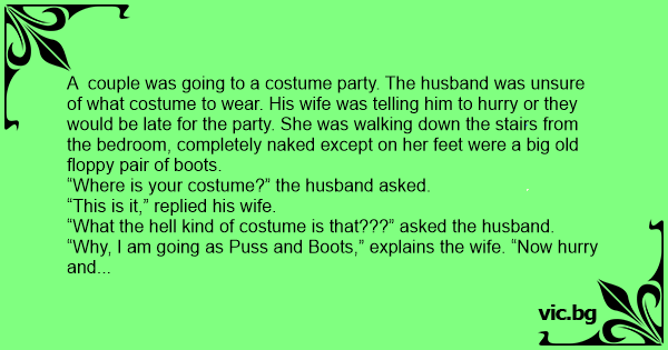 A couple was going to a costume party. The husband was unsure of what costume to wear. His wife was telling him to hurry or they would be late for the party. She was walking down the stairs from the bedroom, completely nакеd except on her feet were a big old floppy pair of boots.