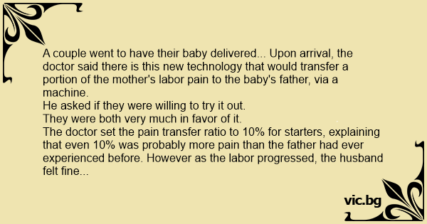 A couple went to have their baby delivered... Upon arrival, the doctor said there is this new technology that would transfer a portion of the mother's labor pain to the baby's father, via a machine.