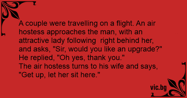 A couple were travelling on a flight. An air hostess approaches the man, with an attractive lady following right behind her, and asks, "Sir, would you like an upgrade?"