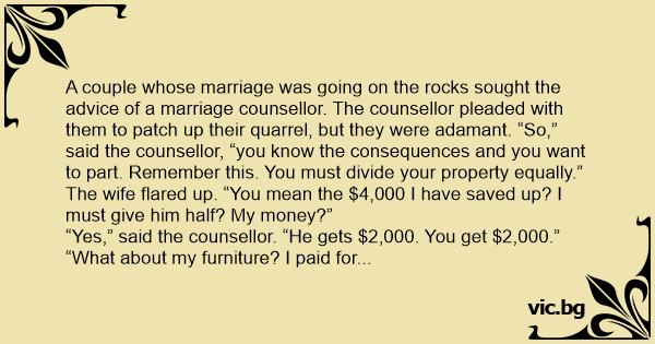 A couple whose marriage was going on the rocks sought the advice of a marriage counsellor. The counsellor pleaded with them to patch up their quarrel, but they were adamant. “So,” said the counsellor, “you know the consequences and you want to part. Remember this. You must divide your property equally.”