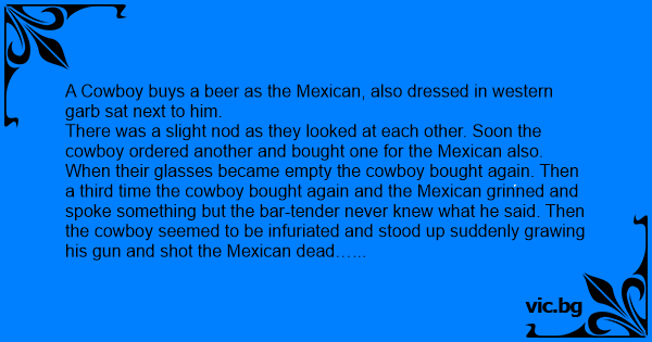 There was a slight nod as they looked at each other. Soon the cowboy ordered another and bought one for the Mexican also. When their glasses became empty the cowboy bought again. Then a third time the cowboy bought again and the Mexican grinned and spoke something but the bar-tender never knew what he said. Then the cowboy seemed to be infuriated and stood up suddenly grawing his gun and shot the Mexican dead…