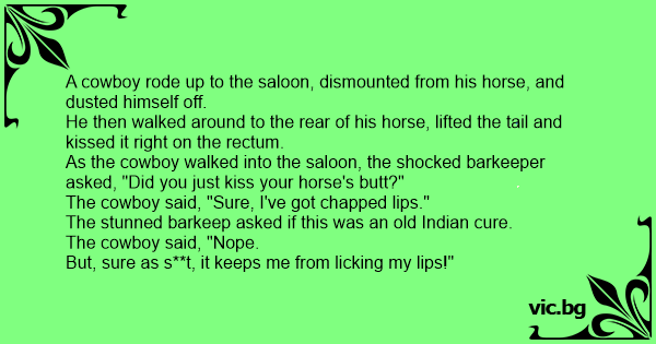 As the cowboy walked into the saloon, the shocked barkeeper asked, "Did you just kiss your horse's вuтт?"