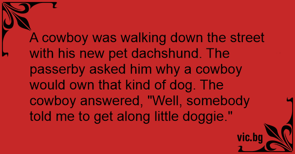 A cowboy was walking down the street with his new pet dachshund. The passerby asked him why a cowboy would own that kind of dog. The cowboy answered, "Well, somebody told me to get along little doggie."