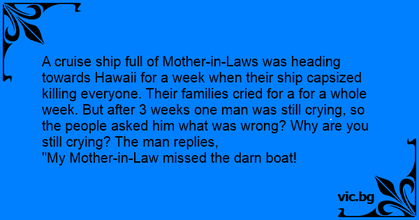 A cruise ship full of Mother-in-Laws was heading towards Hawaii for a week when their ship capsized killing everyone. Their families cried for a for a whole week. But after 3 weeks one man was still crying, so the people asked him what was wrong? Why are you still crying? The man replies,