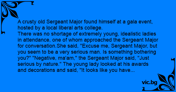 There was no shortage of extremely young, idealistic ladies in attendance, one of whom approached the Sergeant Major for conversation.She said, "Excuse me, Sergeant Major, but you seem to be a very serious man. Is something bothering you?" "Negative, ma'am," the Sergeant Major said, "Just serious by nature." The young lady looked at his awards and decorations and said, "It looks like you have seen a lot of action."The Sergeant Major's short reply was, "Yes, ma'am, a lot of action." The young lady, tiring of trying to start up a conversation, said, "You know, you should lighten up a little. Relax and enjoy yourself." The Sergeant Major just stared at her in his serious manner. Finally the young lady said, "You know, I hope you don't take this the wrong way, but when is the last time you had sеx?" The Sergeant Major looked at her and replied, "1955." She said, "Well, there you are. You really need to chill out and quit taking everything so seriously! I mean, no sеx since 1955! Isn't that a little extreme?" The Sergeant Major, glancing at his watch, said in his matter-of-fact voice, "You think so? It's only 2130 now."
