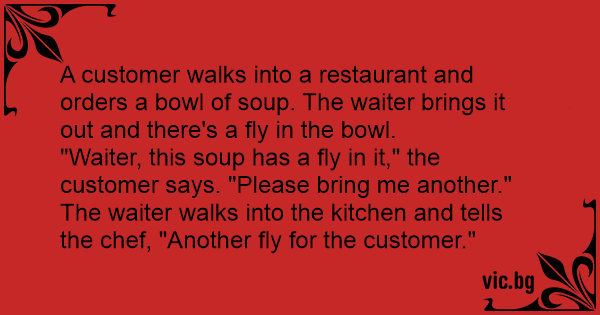 A customer walks into a restaurant and orders a bowl of soup. The waiter brings it out and there's a fly in the bowl.