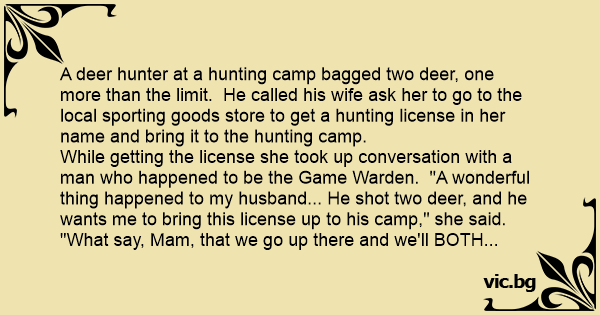 A deer hunter at a hunting camp bagged two deer, one more than the limit. He called his wife ask her to go to the local sporting goods store to get a hunting license in her name and bring it to the hunting camp.