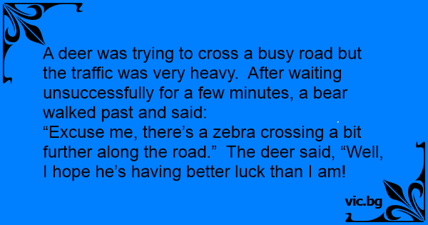 “Excuse me, there’s a zebra crossing a bit further along the road.” The deer said, “Well, I hope he’s having better luck than I am!