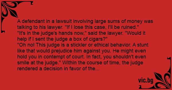 "Oh no! This judge is a stickler or ethical behavior. A stunt like that would prejudice him against you. He might even hold you in contempt of court. In fact, you shouldn't even smile at the judge." Within the course of time, the judge rendered a decision in favor of the defendant. As the defendant left the courthouse, he said to his lawyer, "Thanks for the tip about the cigars. It worked!"