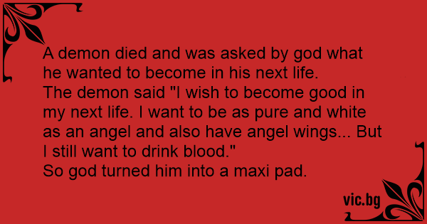 The demon said "I wish to become good in my next life. I want to be as pure and white as an angel and also have angel wings... But I still want to drink blood."