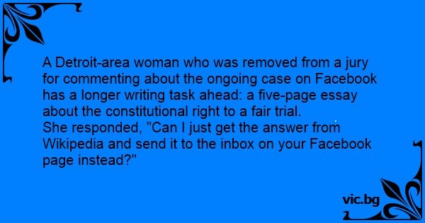 A Detroit-area woman who was removed from a jury for commenting about the ongoing case on Facebook has a longer writing task ahead: a five-page essay about the constitutional right to a fair trial. She responded, "Can I just get the answer from Wikipedia and send it to the inbox on your Facebook page instead?"