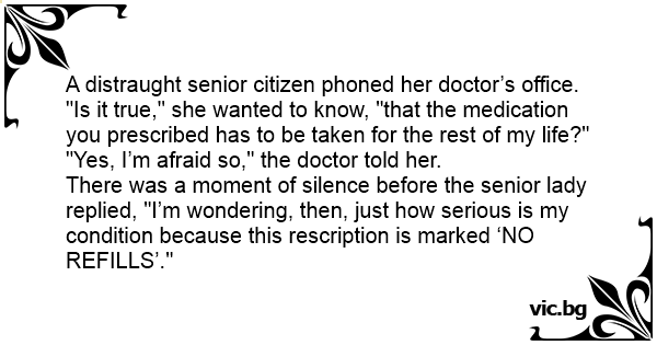 There was a moment of silence before the senior lady replied, "I’m wondering, then, just how serious is my condition because this rescription is marked ‘NO REFILLS’."
