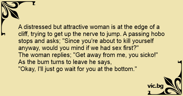 A distressed but attractive woman is at the edge of a cliff, trying to get up the nerve to jump. A passing hobo stops and asks; "Since you're about to кill yourself anyway, would you mind if we had sеx first?"