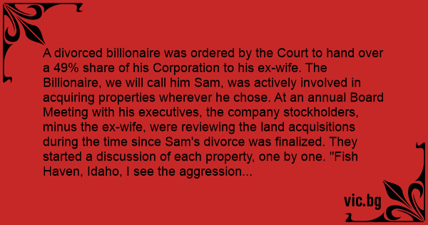 A divorced billionaire was ordered by the Court to hand over a 49% share of his Corporation to his ex-wife. The Billionaire, we will call him Sam, was actively involved in acquiring properties wherever he chose. At an annual Board Meeting with his executives, the company stockholders, minus the ex-wife, were reviewing the land acquisitions during the time since Sam's divorce was finalized. They started a discussion of each property, one by one. "Fish Haven, Idaho, I see the aggression expression on that purchase", the one executive commented. Sam gave his nod of admission of its truth. The next company man made his statement, "Dog Walk, Kentucky", "Again we have an aggression expression, don't we Sam?" Sam concurred with that fact again. "Horse heads, New York," and the company man said,