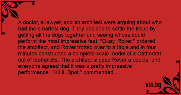 A doctor, a lawyer, and an architect were arguing about who had the smartest dog. They decided to settle the issue by getting all the dogs together and seeing whose could perform the most impressive feat. "Okay, Rover," ordered the architect, and Rover trotted over to a table and in four minutes constructed a complete scale model of a Cathedral out of toothpicks. The architect slipped Rover a cookie, and everyone agreed that it was a pretty impressive performance. "Hit it, Spot," commanded the doctor. Spot lost no time in performing an emergency Caesarean on a соw. Three minutes later the proud mother of a healthy little heifer was all sewed up and doing fine. Not bad, conceded the onlookers, and Spot got a cookie from the doctor. "Your turn, Fella," said the lawyer. Over went Fella, sсrеwеd the other two dogs, took their cookies, and went out to lunch.