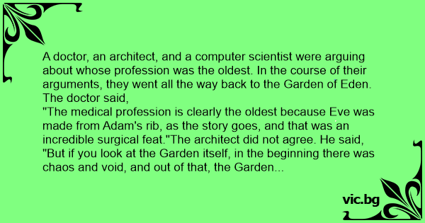A doctor, an architect, and a computer scientist were arguing about whose profession was the oldest. In the course of their arguments, they went all the way back to the Garden of Eden. The doctor said,