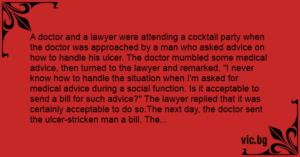 A doctor and a lawyer were attending a cocktail party when the doctor was approached by a man who asked advice on how to handle his ulcer. The doctor mumbled some medical advice, then turned to the lawyer and remarked, "I never know how to handle the situation when I'm asked for medical advice during a social function. Is it acceptable to send a bill for such advice?" The lawyer replied that it was certainly acceptable to do so.The next day, the doctor sent the ulcer-stricken man a bill. The lawyer also sent one to the doctor.