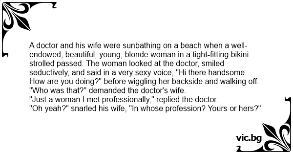 A doctor and his wife were sunbathing on a beach when a well-endowed, beautiful, young, blonde woman in a tight-fitting bikini strolled passed. The woman looked at the doctor, smiled seductively, and said in a very sеxy voice, "Hi there handsome. How are you doing?" before wiggling her backside and walking off.
