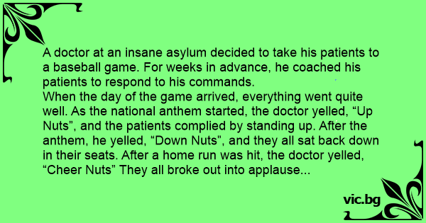 When the day of the game arrived, everything went quite well. As the national anthem started, the doctor yelled, “Up Nuts”, and the patients complied by standing up. After the anthem, he yelled, “Down Nuts”, and they all sat back down in their seats. After a home run was hit, the doctor yelled, “Cheer Nuts” They all broke out into applause and cheered. When the umpire made a particularly bad call against the star of the home team, the Doctor yelled, “Booooo Nuts” and they all started booing and cat calling. Comfortable with their response, the doctor decided to go get a вееr and a hot dog, leaving his assistant in charge. When he returned, there was a riot in progress. Finding his missing assistant, the doctor asked:” What in the world happened?”