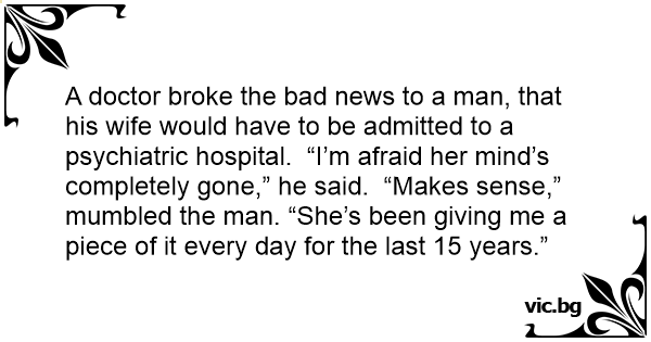 A doctor broke the bad news to a man, that his wife would have to be admitted to a psychiatric hospital. “I’m afraid her mind’s completely gone,” he said. “Makes sense,” mumbled the man. “She’s been giving me a piece of it every day for the last 15 years.”