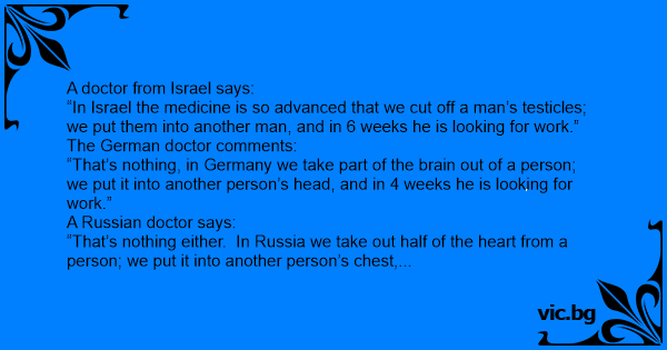 “In Israel the medicine is so advanced that we cut off a man’s testicles; we put them into another man, and in 6 weeks he is looking for work.”