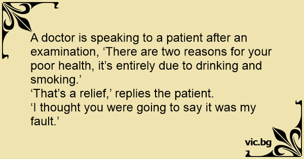 Лекар разговаря с пациент след преглед: - Вашето лошо здраве, се дължи изцяло на пиенето и пушенето. - Благодаря ви докторе! - отговаря пациентът - Мислех, че ще кажете, че вината е моя.“