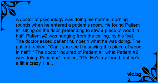 A doctor of psychology was doing his normal morning rounds when he entered a patient's room. He found Patient #1 sitting on the floor, pretending to saw a piece of wood in half. Patient #2 was hanging from the ceiling, by his feet. The doctor asked patient number 1 what he was doing. The patient replied, "Can't you see I'm sawing this piece of wood in half? " The doctor inquired of Patient #1 what Patient #2 was doing. Patient #1 replied, "Oh. He's my friend, but he's a little crazy. He thinks he's a lightbulb. " The doctor looks up and notices Patient #2's face is going all red. The doctor asks Patient #1, "If he's your friend, you should get him down from there before he hurts himself " Patient #1 replies, "What? And work in the dark? "