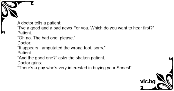 Läkaren till patienten: - Jag har en bra och en dålig nyhet. - Vilken är den dåliga nyheten? - Att vi måste amputera ditt ben. - Vilken är den goda nyheten? - Att jag kan tänka mej att köpa dina...