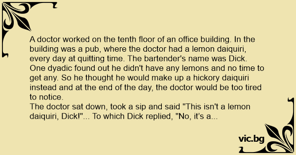 A doctor worked on the tenth floor of an office building. In the building was a pub, where the doctor had a lemon daiquiri, every day at quitting time. The bartender's name was Diск.