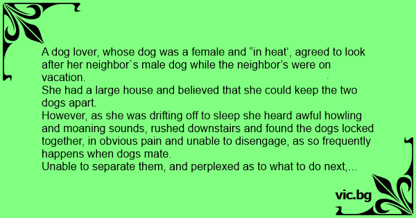 A dog lover, whose dog was a female and “in heat’, agreed to look after her neighbor`s male dog while the neighbor’s were on vacation.
