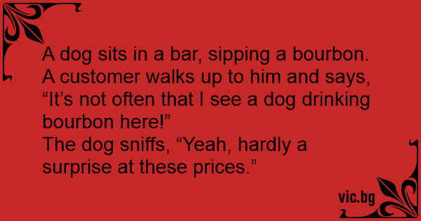 A customer walks up to him and says, “It’s not often that I see a dog drinking bourbon here!”