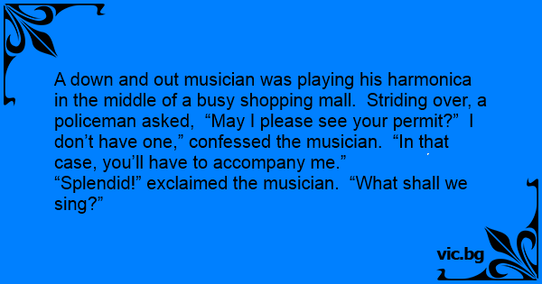 A down and out musician was playing his harmonica in the middle of a busy shopping mall. Striding over, a policeman asked, “May I please see your permit?” I don’t have one,” confessed the musician. “In that case, you’ll have to accompany me.”