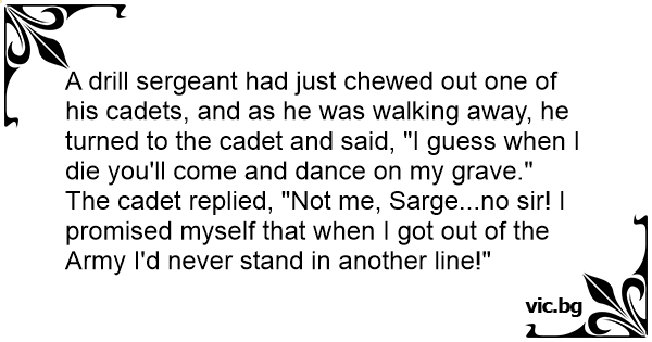 A drill sergeant had just chewed out one of his cadets, and as he was walking away, he turned to the cadet and said, "I guess when I die you'll come and dance on my grave."