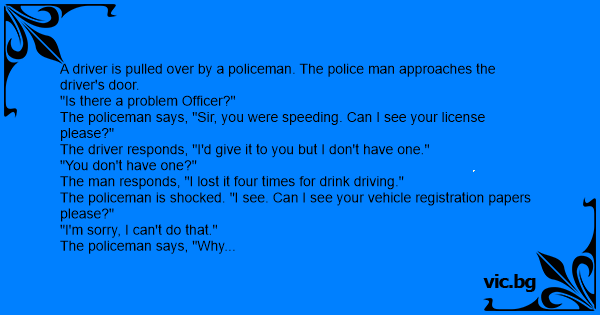 Un policier arrête un homme qui roulait à une vitesse excessive. Le policier demande : - Puis-je avoir votre permis de conduire s.v.p. ? - J'en ai pas. Ils me l'ont saisi pour la 5e fois. -...