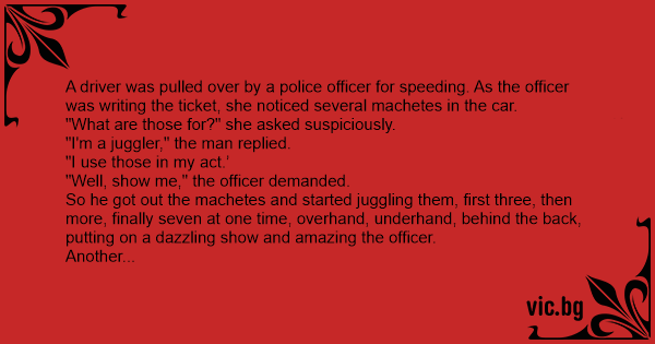 So he got out the machetes and started juggling them, first three, then more, finally seven at one time, overhand, underhand, behind the back, putting on a dazzling show and amazing the officer.