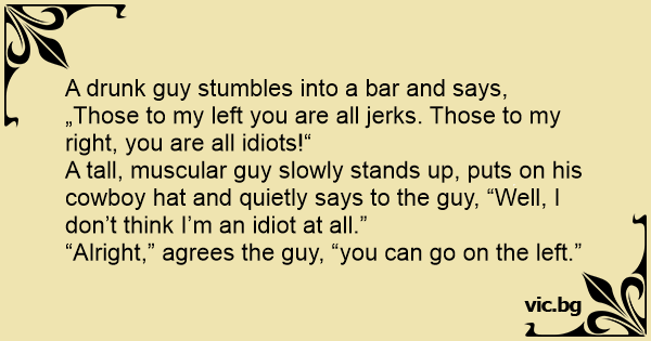 A drunк guy stumbles into a bar and says, „Those to my left you are all jerks. Those to my right, you are all idiots!“
