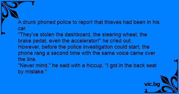 Anruf bei der Funkzentrale der Polizei: "Helfen Sie mir, man hat aus meinem Wagen Lenkrad, Handbremse und Armaturenbrett geklaut!" Minuten später meldet sich der Streifenwagen: "Hat sich erledigt. Der Kerl ist besoffen und sitzt auf dem Rücksitz..."