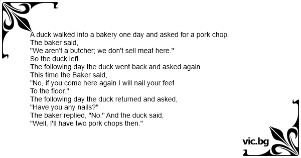 A duck walked into a bakery one day and asked for a pork chop.